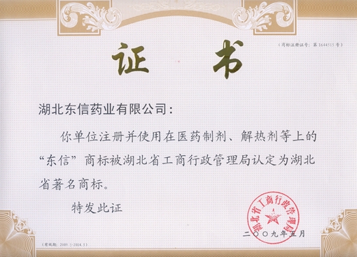 2009年5月,湖北东信药业有限公司注册并使用在医药制剂、解热剂上的“东信”商标被湖北省工商行政管理局认定为湖北省著名商标。