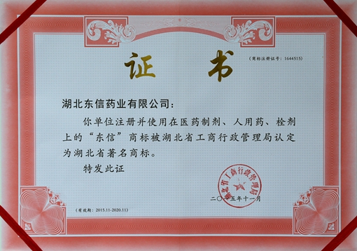 2015年11月,湖北东信药业有限公司注册并使用在医药制剂、人用药、栓剂上的“东信”商标再次被湖北省工商行政管理局认定为湖北省著名商标。