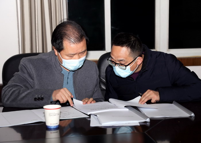 陈再新(中)、张凯明(左一)、熊启文(左三)听取工作汇报。