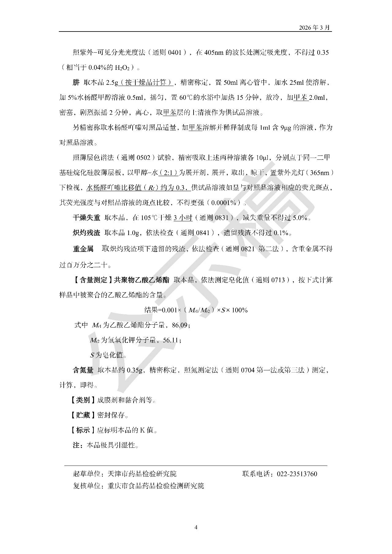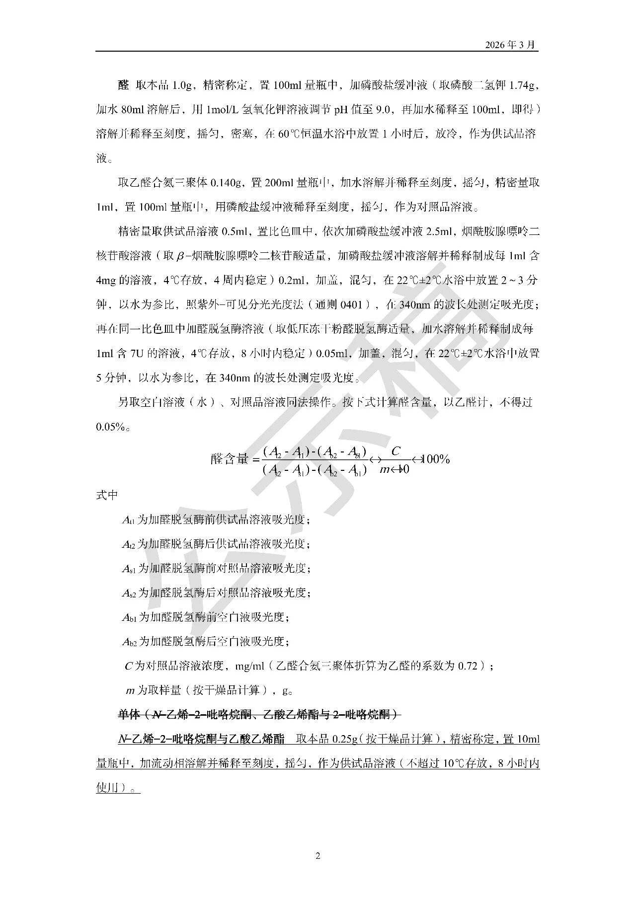 增订“N-乙烯-2-吡咯烷酮与乙酸乙烯酯”和“2-吡咯烷酮”,删除“单体(N-乙烯-2-吡咯烷酮、乙酸乙烯酯与2-吡咯烷酮)”:参考USP-NF2021增修订。“N-乙烯-2-吡咯烷酮与乙酸乙烯酯”项下,供试品与对照品溶液的存放温度与时间会影响乙酸乙烯酯在溶液中的稳定性,参考实验结果,建议相关溶液制备后的放置条件设定为“不超过10℃,8小时内测定”。